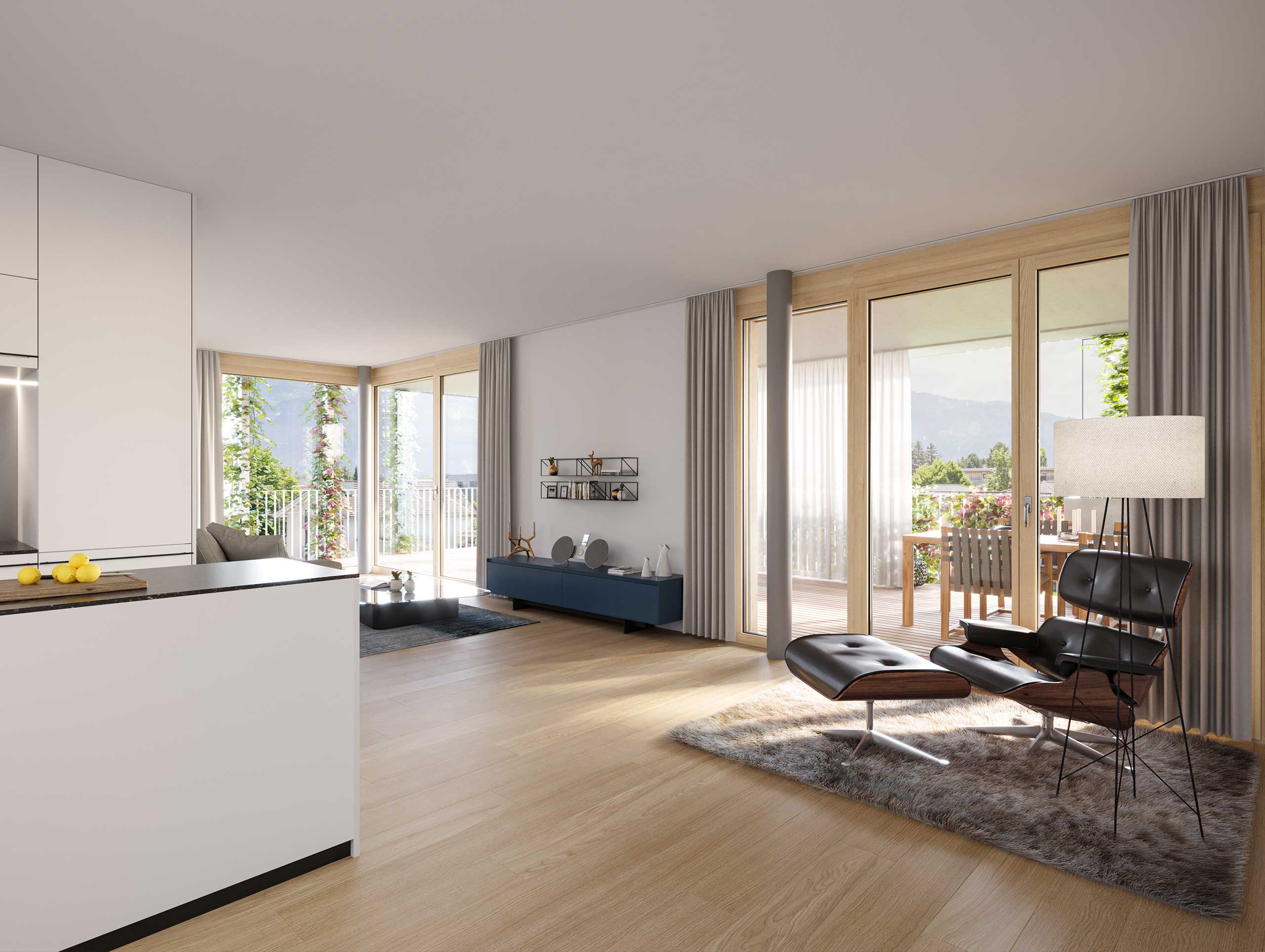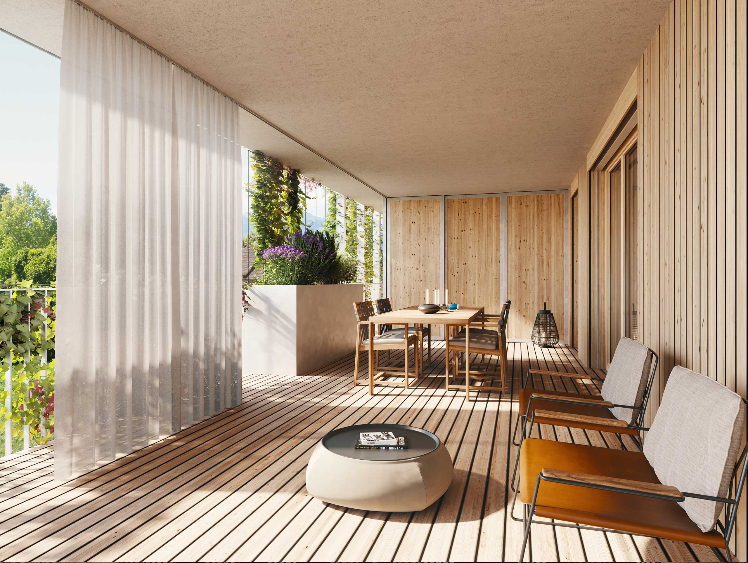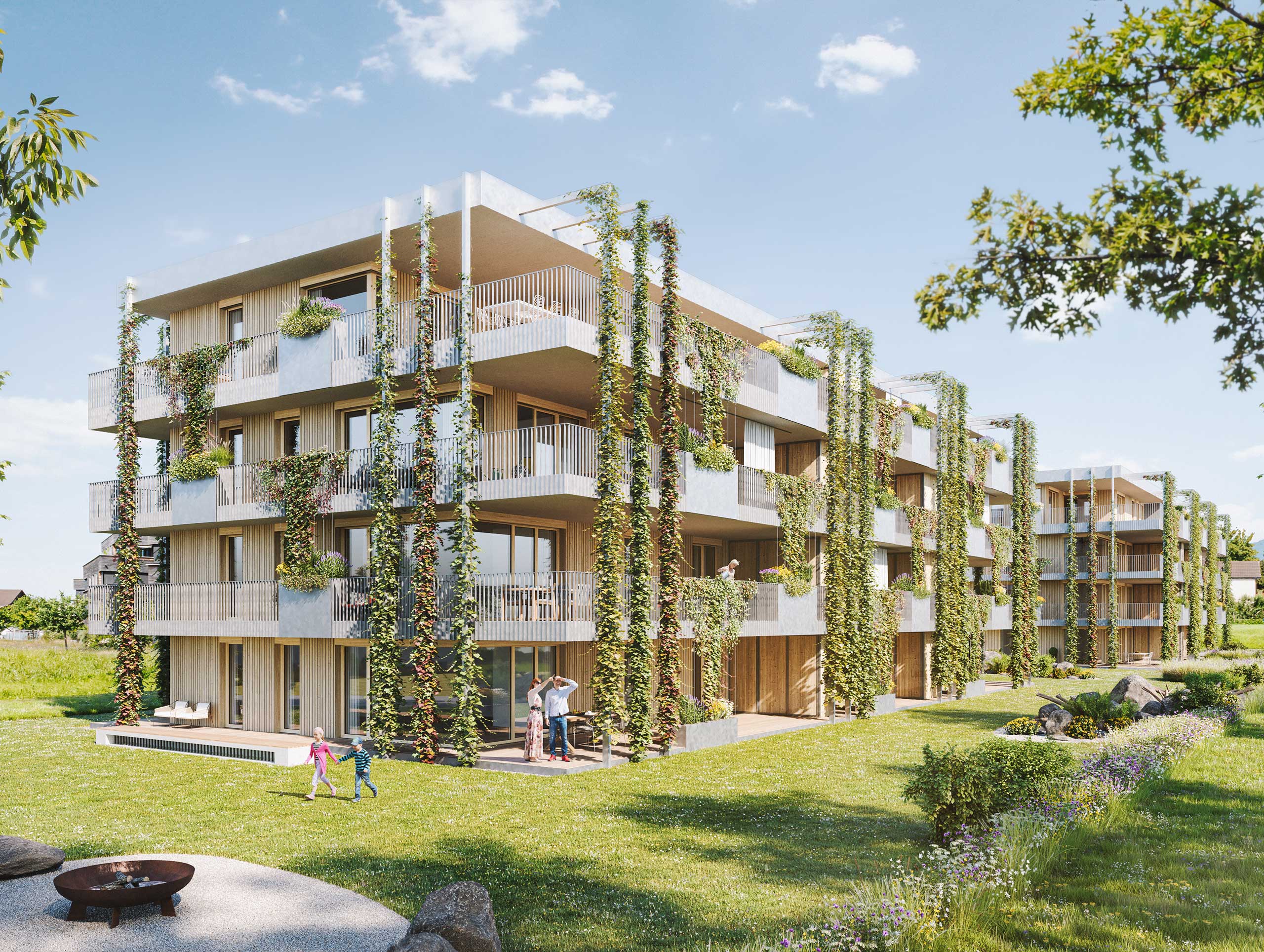 Für frische Luft finden sich in jeder Wohnung Lüftungsgeräte mit Wärmerückgewinnung und die biodiverse Fassadenbegrünung mit spielerischen Licht- und Schatten- Kombinationen sorgt für ein angenehmes Wohnklima im Innen- und Aussenraum. Daneben bietet sie einen natürlichen Schutz vor Witterungseinflüssen, vor Schall und vor Einblicken. Die Bewässerung dieser Begrünung erfolgt automatisch über einen Regenwassertank. Beim Bau wird bei der Herkunft des Holzes darauf geachtet, dass es, wenn immer möglich, aus der Schweiz stammt und für die Beleuchtung werden energie- sparende LEDs eingesetzt. Ergänzt wird der Wohnraum mit einer herrlichen, grünen Umgebung für Bewegung und Erholung in jedem Alter.